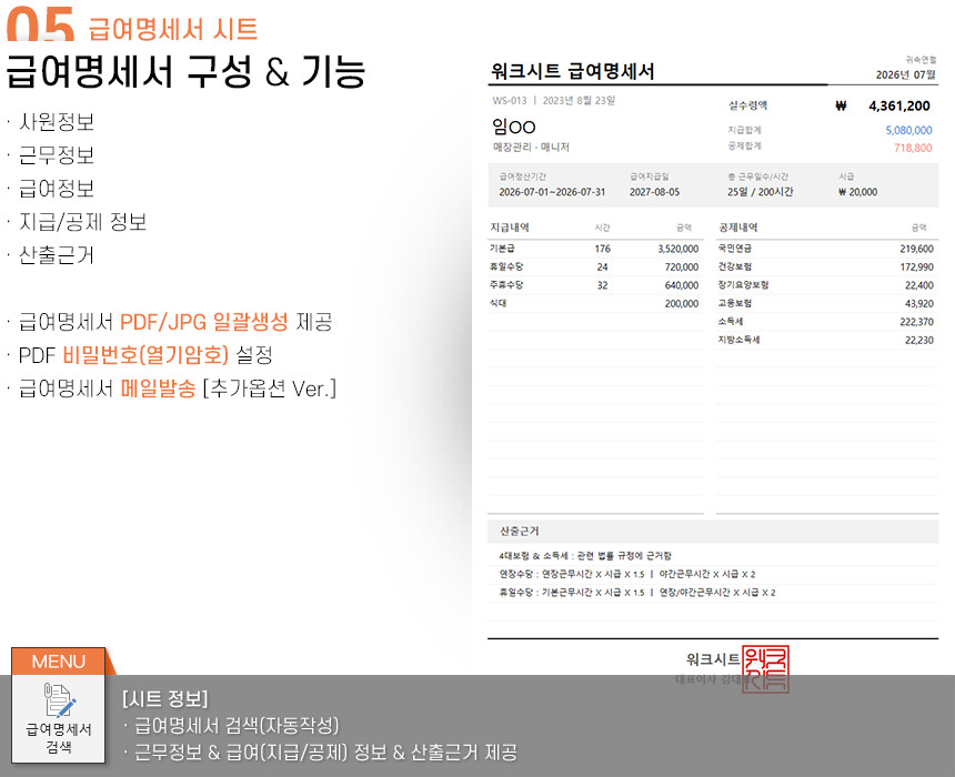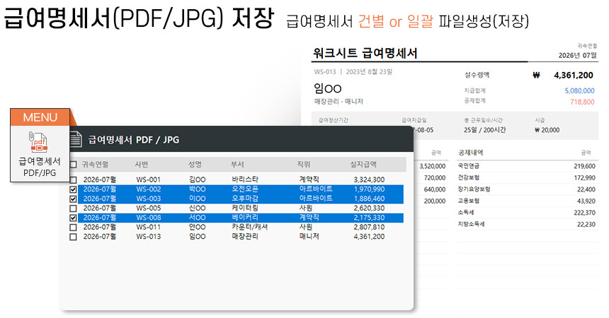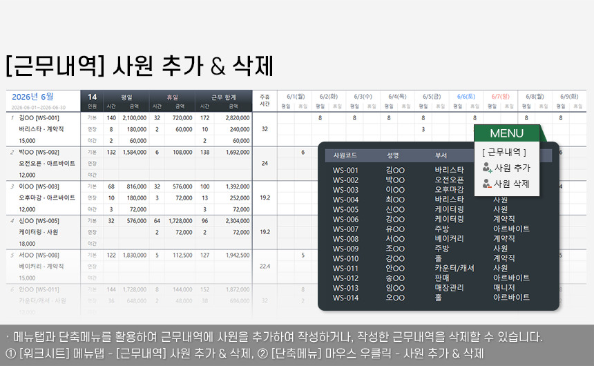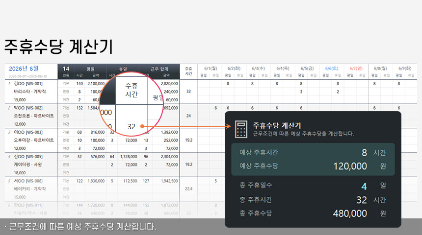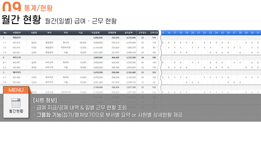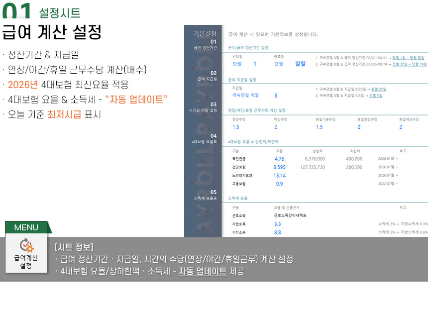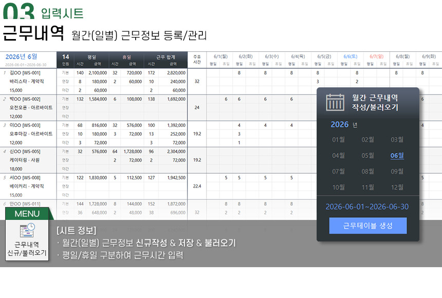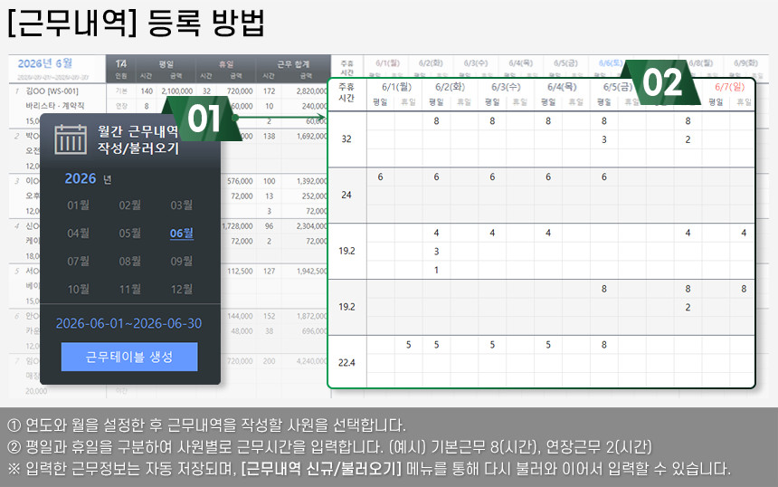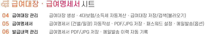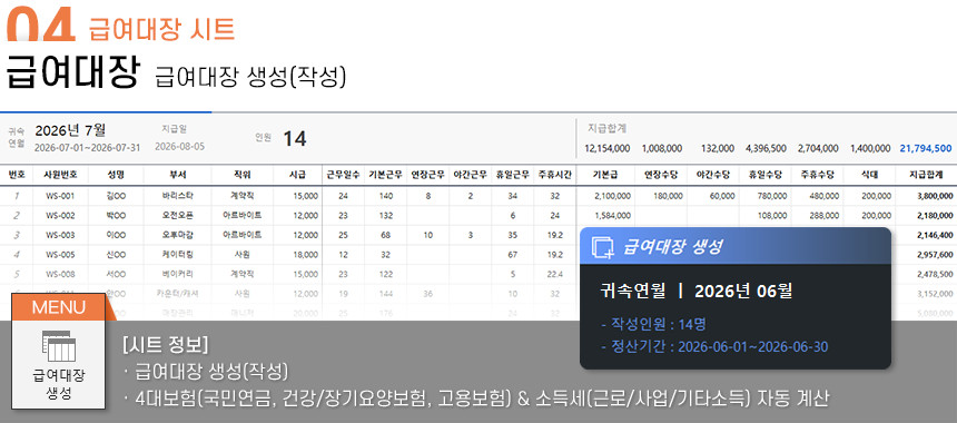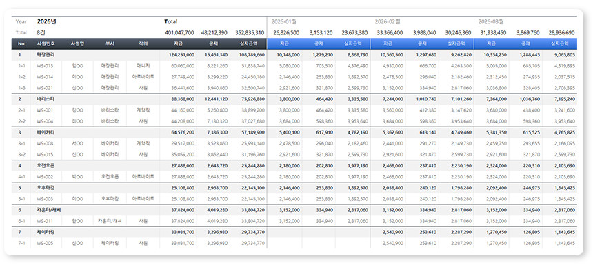 아르바이트/파트타임의 월간(일별) 근무내역을 등록/관리하며, 4대보험&소득세 계산 및 급여대장/급여명세서 자동작성을 제공합니다.