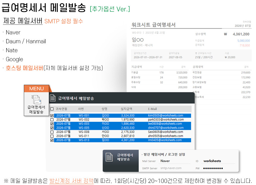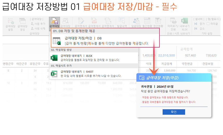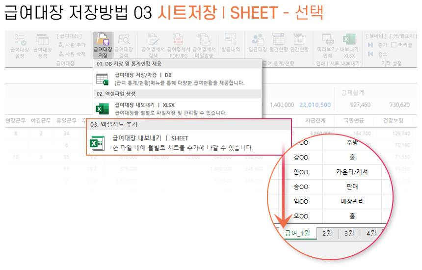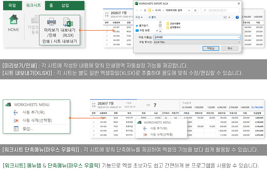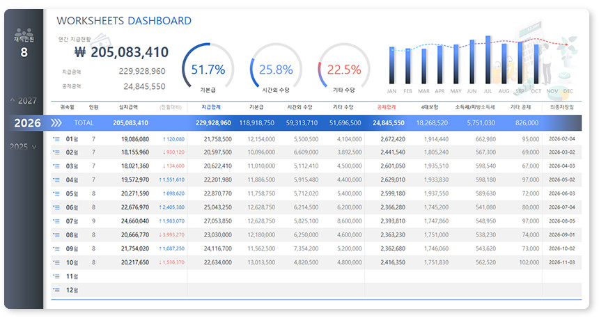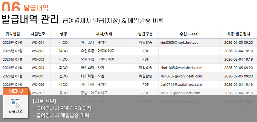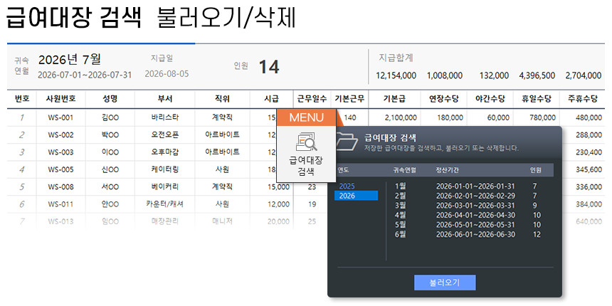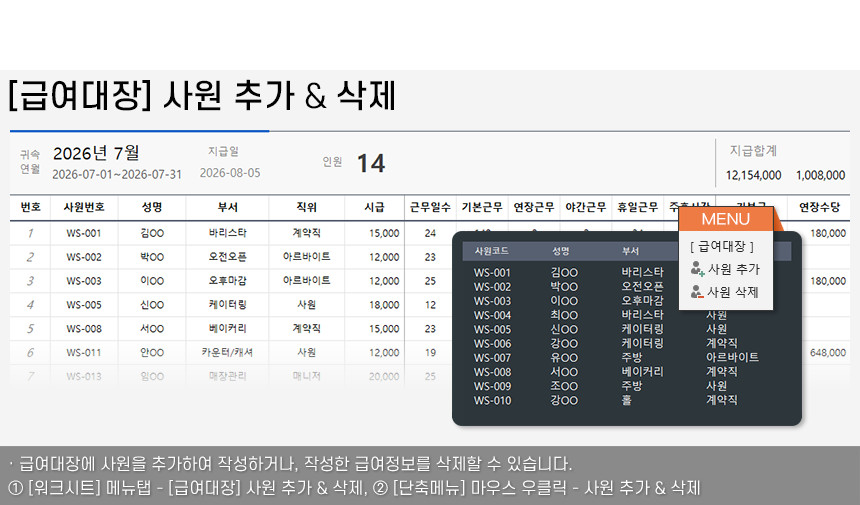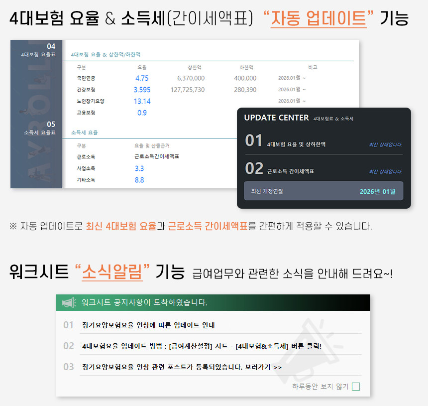 아르바이트/파트타임의 월간(일별) 근무내역을 등록/관리하며, 4대보험&소득세 계산 및 급여대장/급여명세서 자동작성을 제공합니다.