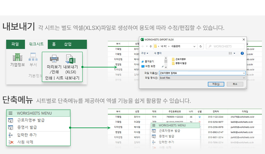 같은 엑셀 파일을 공유폴더 또는 워크시트 클라우드 서비스를 통해 함께 사용해 주시면 됩니다.