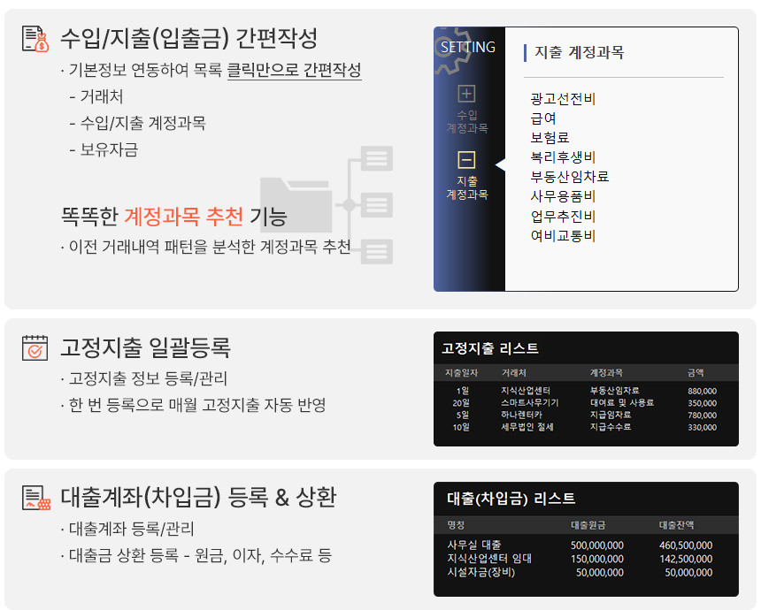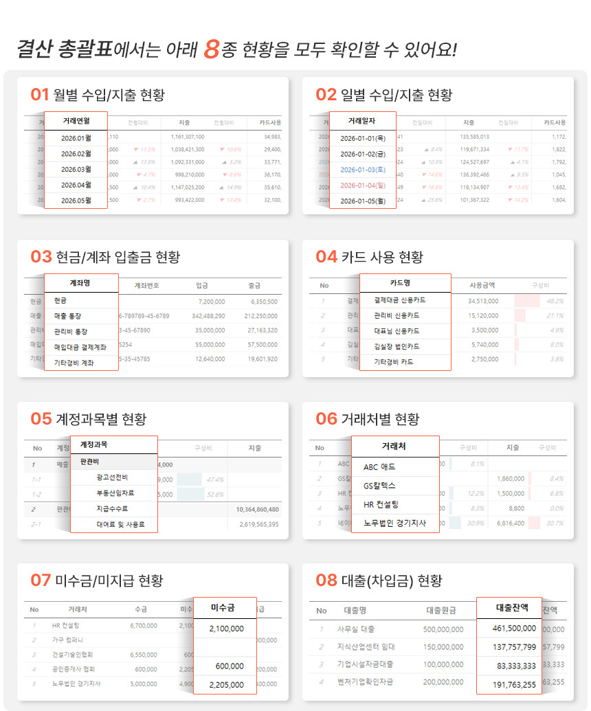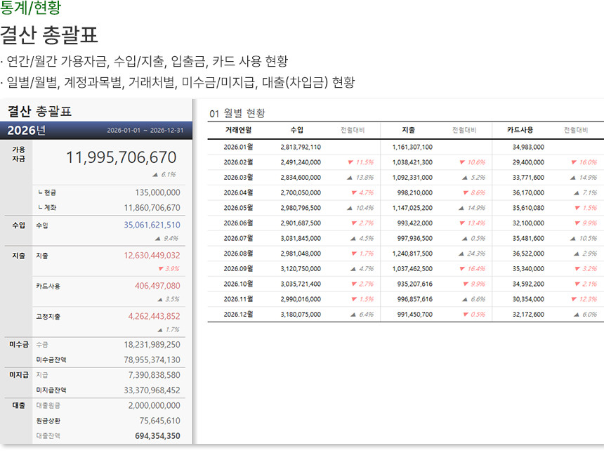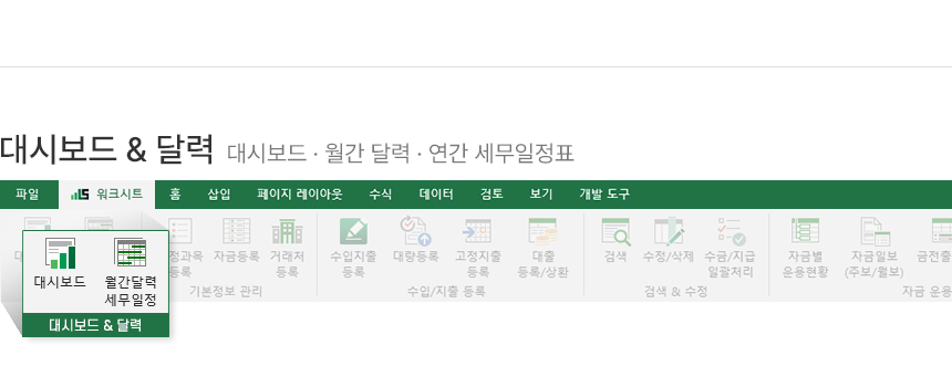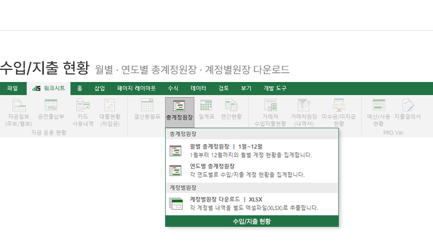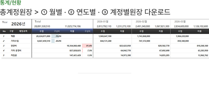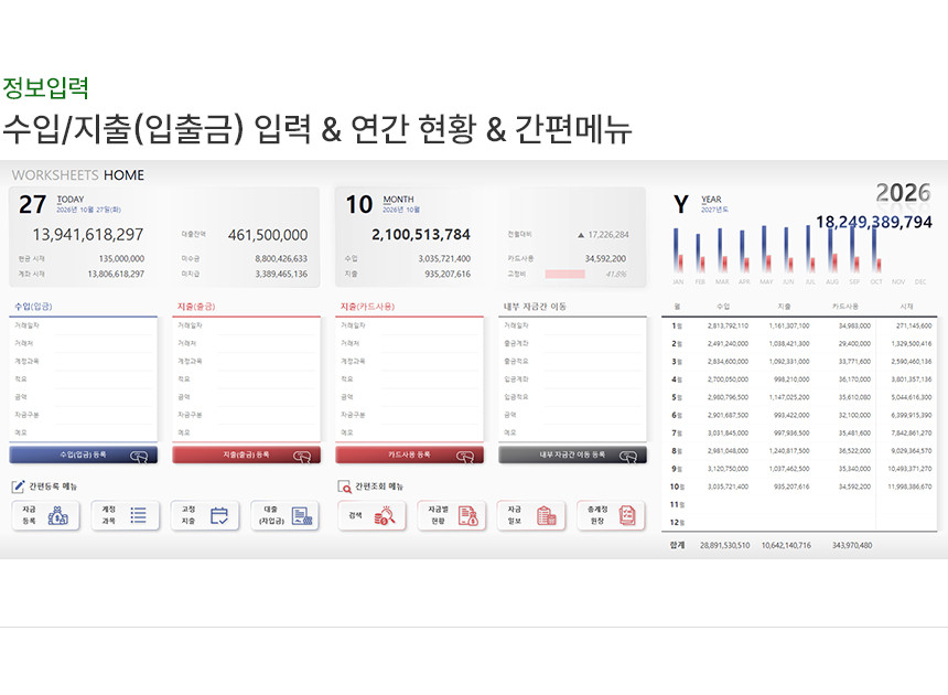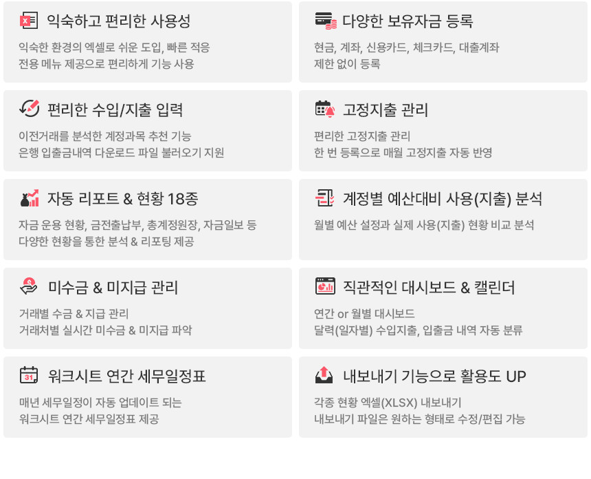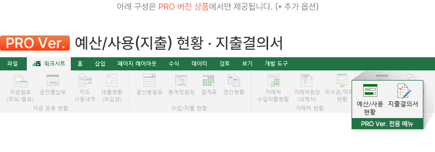 사업장 수입지출, 입출금, 자금일보/금전출납부/총계정원장, 지출결의서, 예산관리, 매년 세무일정 자동 업데이트 등의 다양한 구성과 기능을 포함판 프로그램형 엑셀콘텐츠입니다.