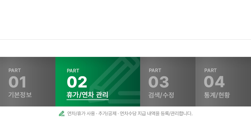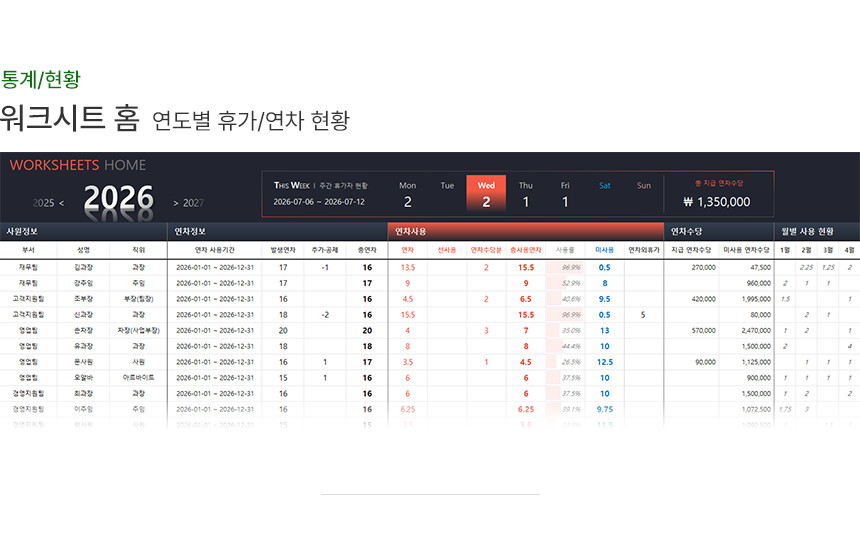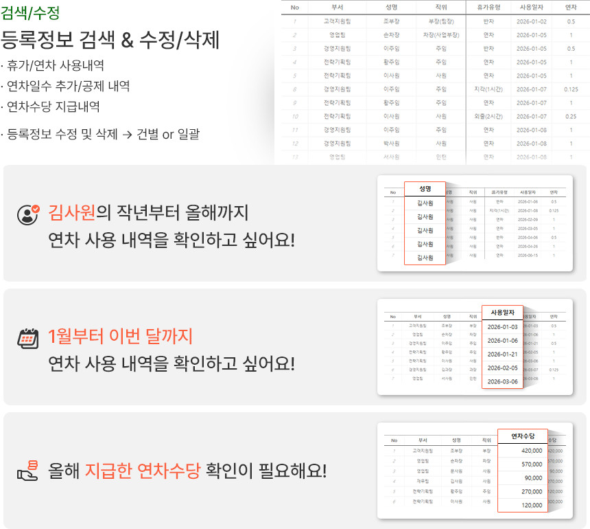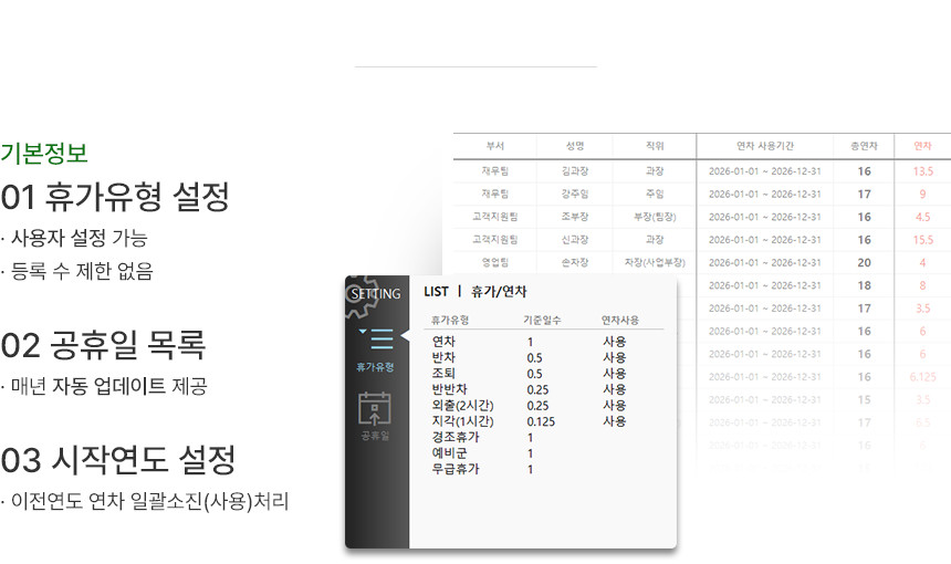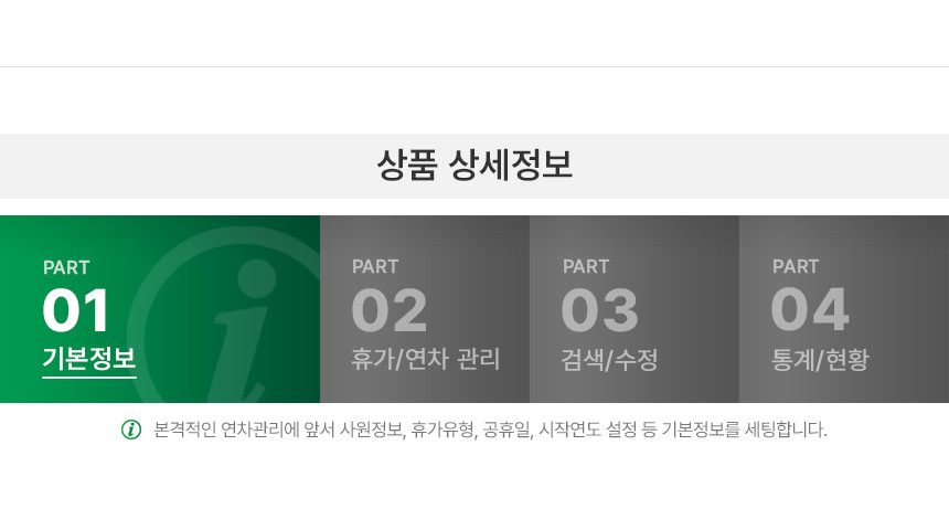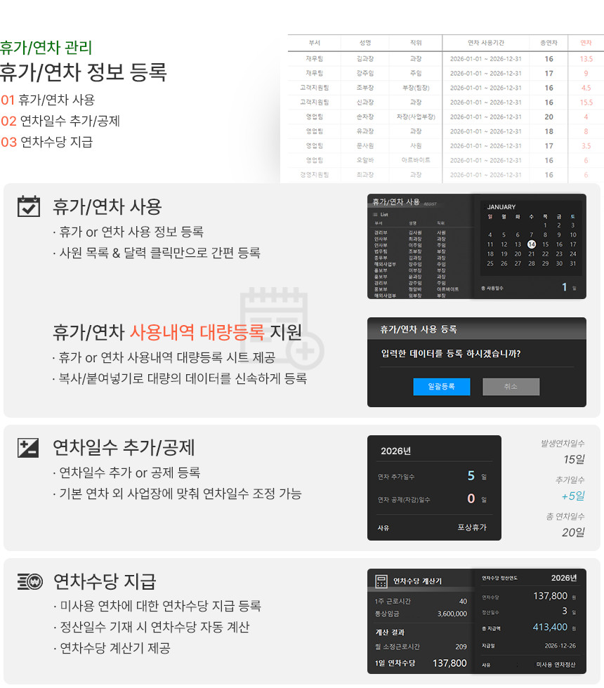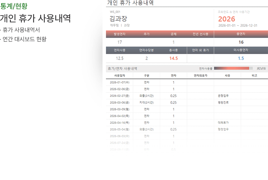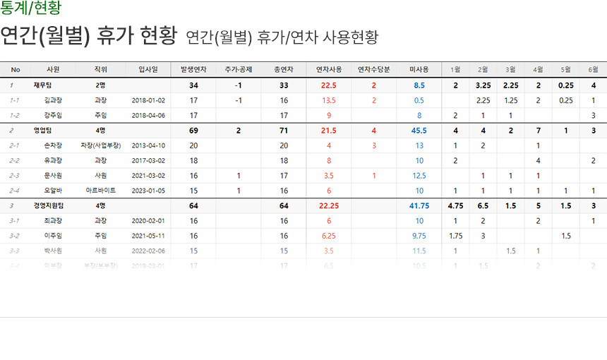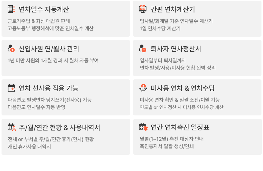 회계일을 기준으로 최신 근로기준법을 적용한 연차관리와 신입사원 연월차 및 퇴사자 연차정산, 연차수당 관리, 연차사용 촉진제도 등 다양한 현황을 제공합니다.